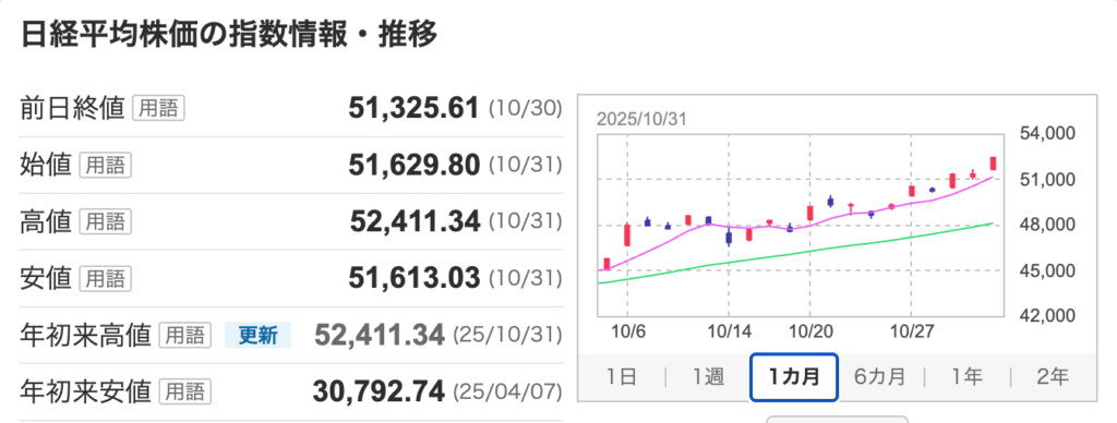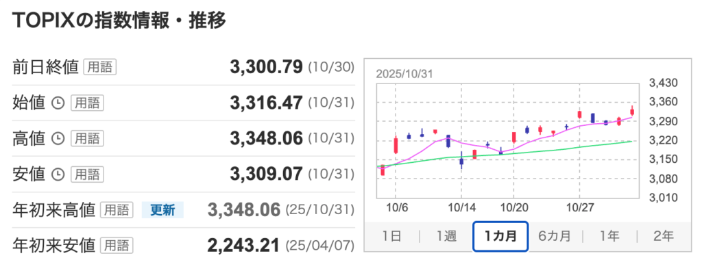 出典:日経平均・TOPIX=日本経済新聞/株探、S&P500=FRED、ドル円=日本銀行「外国為替市況」/チャート画像はYahoo!ファイナンスより(2025年10月)