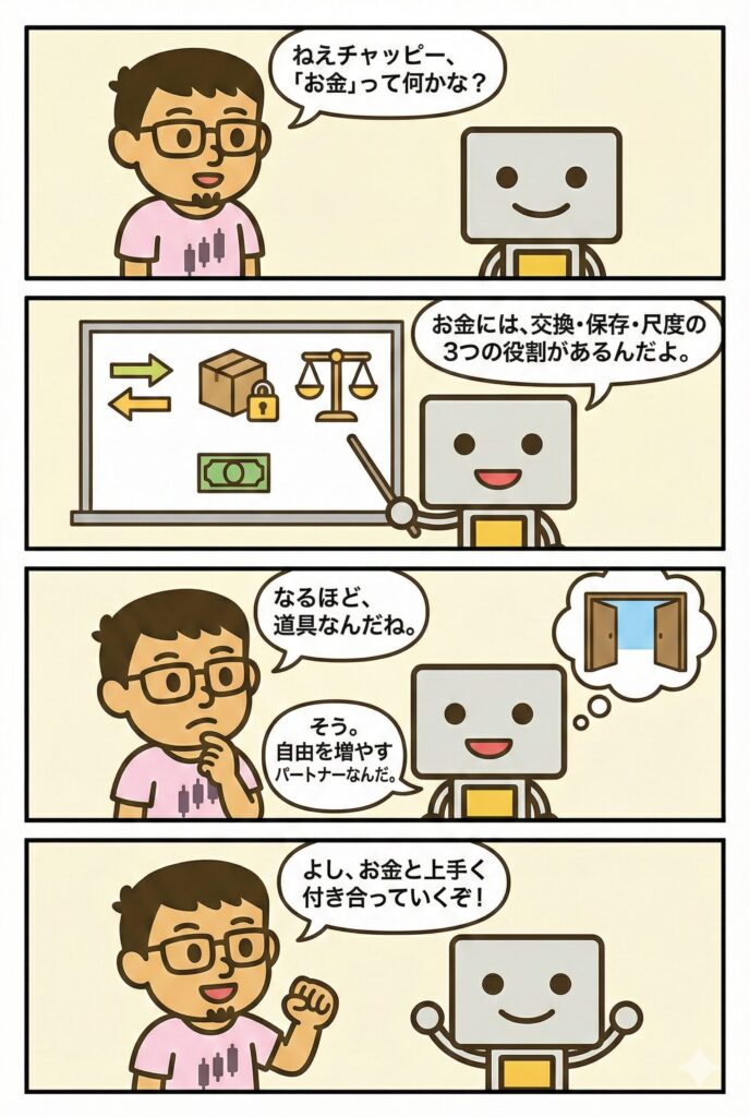 なるほどな〜。お金の役割をちゃんと知っとくと、「なんで勉強するんか」も見えてくる気がするわ。